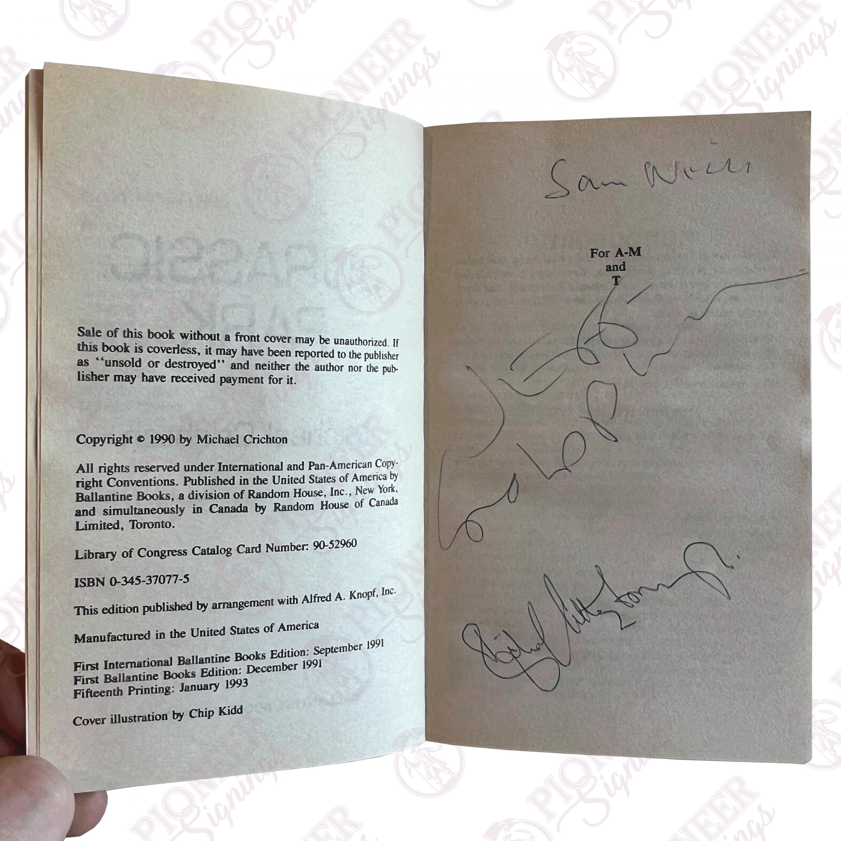 JURASSIC PARK (1993) – Sir Richard Attenborough, Sam Neill and Jeff Goldblum Autographed Paperback Novel |