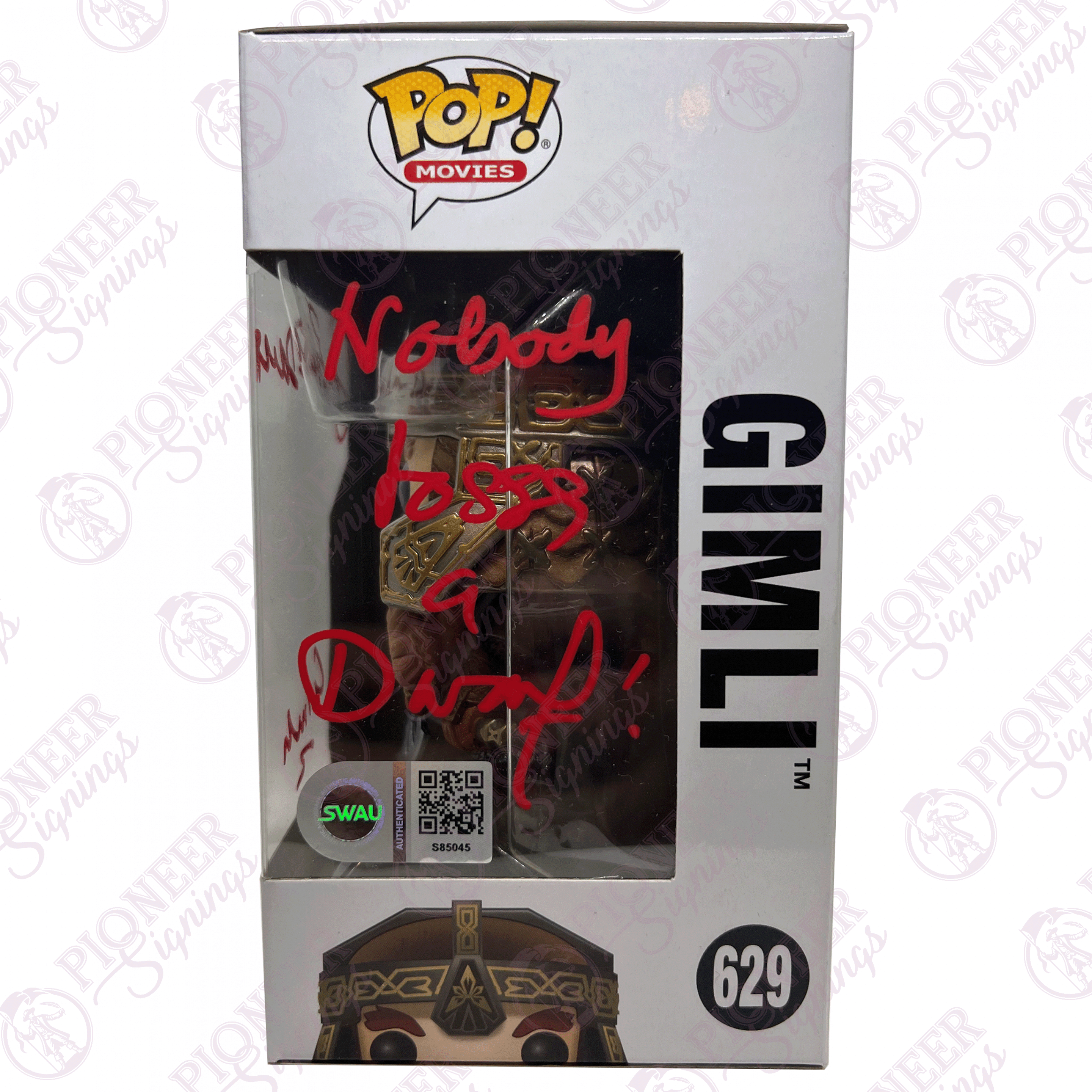 Lord of the Rings Exclusive “Gimli” Funko Pop 629 Signed by John Rhys-Davies with Character Name & Quote “Nobody Tosses a Dwarf! in Red |