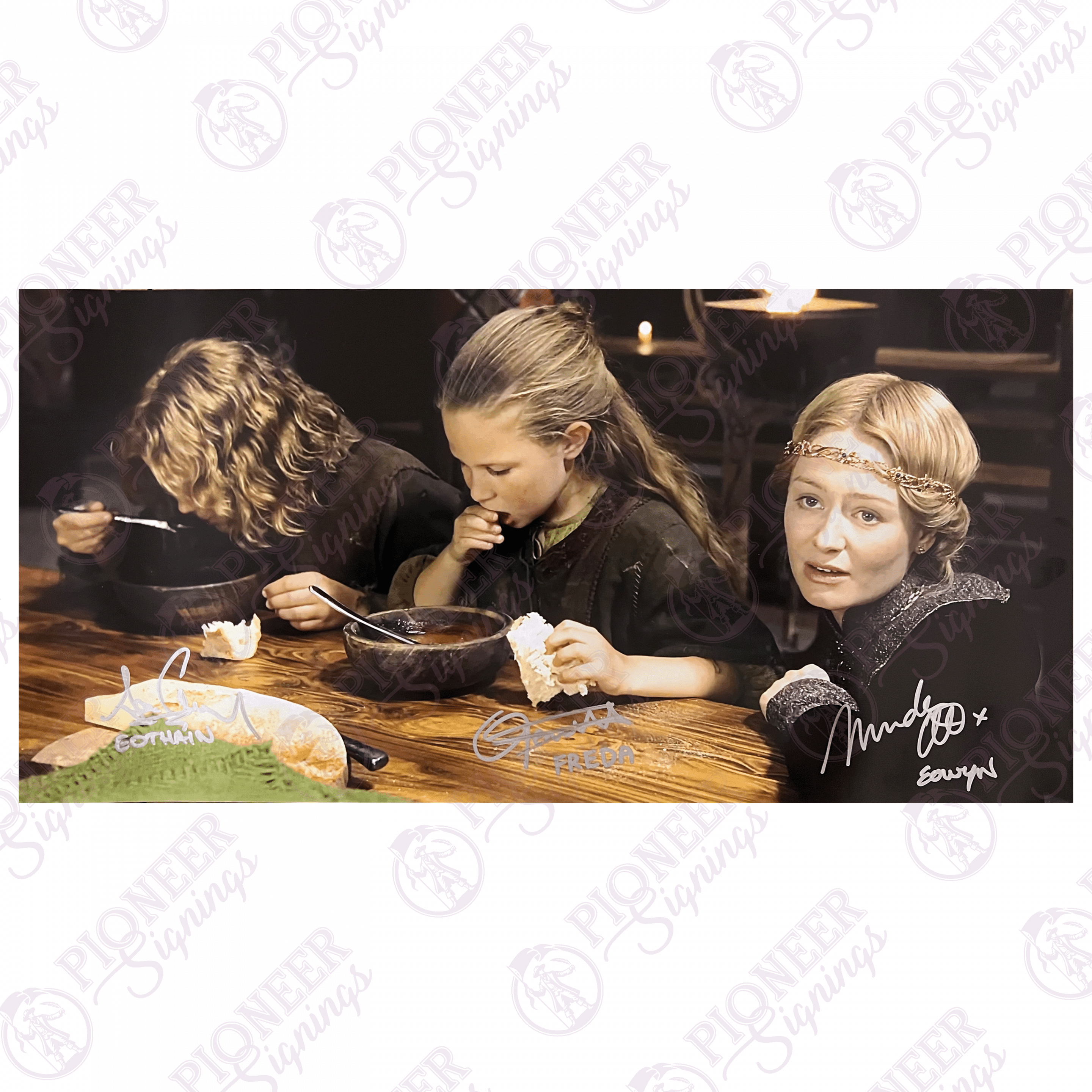 Description | The Golden Hall trio signed 10×20 print of Eowyn with Rohirrim refugee children Freda and Eothain. Signed by Miranda Otto, Olivia Tennet & Sam Comery. This is extremely limited in quantity. |