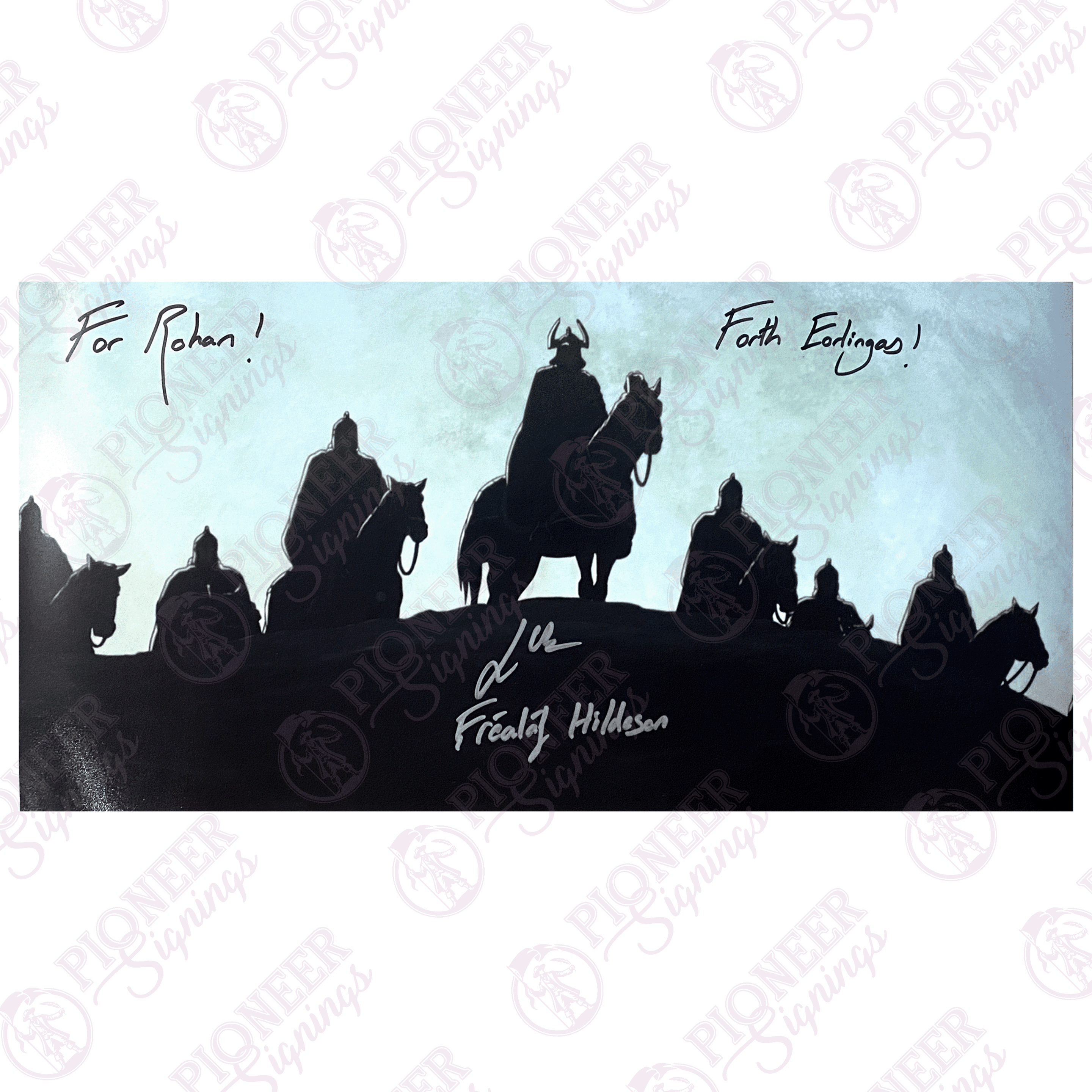The Lord of the Rings: The War of the Rohirrim ‘Fréafláf’ 10″ x 20″ Print Signed by Laurence Ubong Williams with Character Name: Fréaláf Hildeson & Quote: For Rohan! Forth Eorlingas! (Silver Paint & Black) (CoA optional) |
