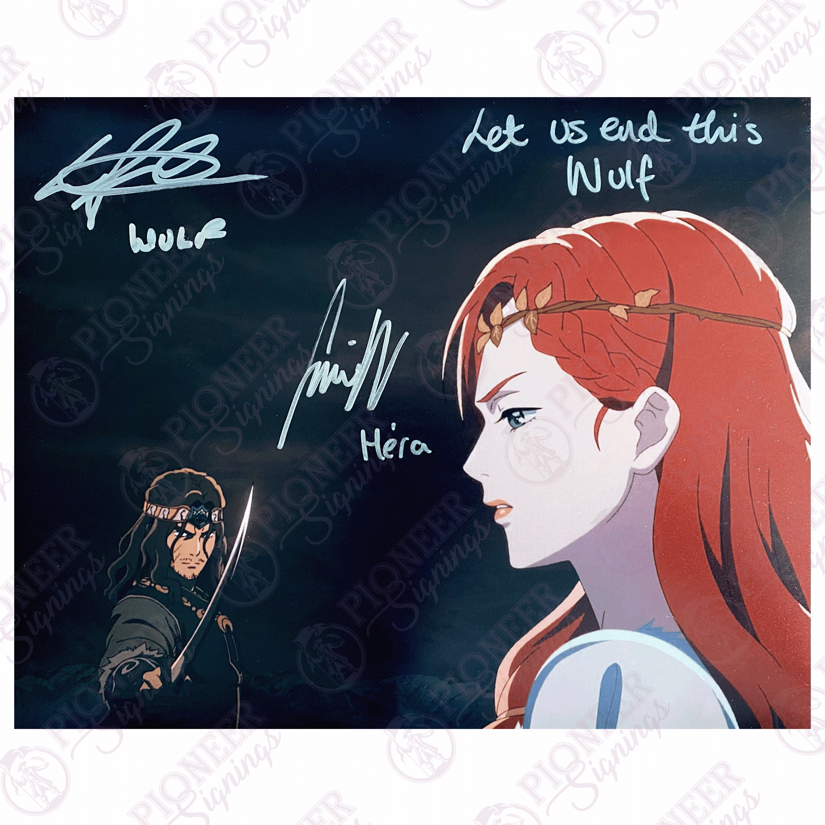 The Lord of the Rings: The War of the Rohirrim ‘Héra & Wulf’ 8″ x 10″ Print Signed by Gaia Wise & Luca Pasqualino with Character Names: Héra, Wulf and Quote: Let us end this Wulf! (Silver Paint) (CoA optional) |