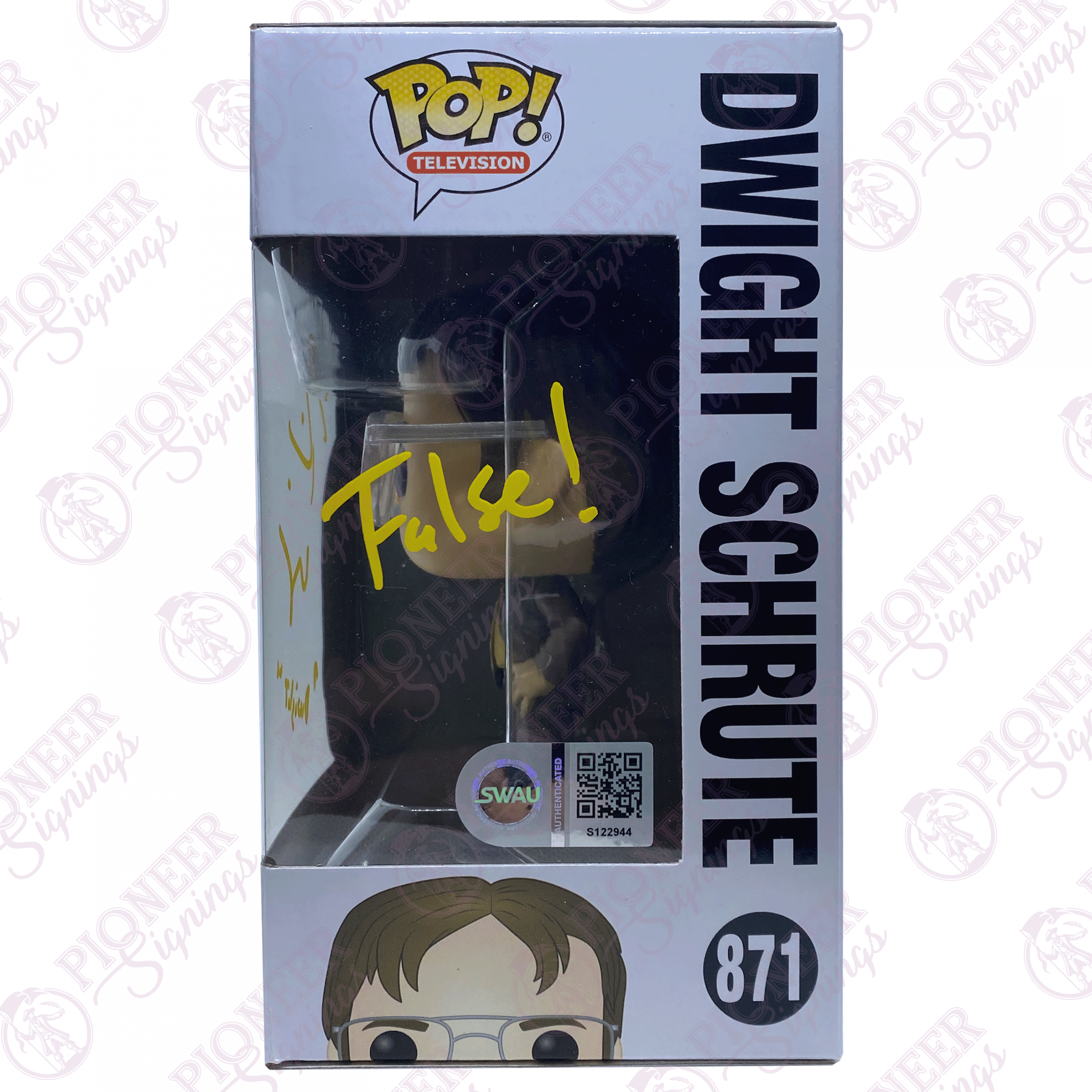 The Office ‘Dwight Schrute’ Funko Pop! 871 Signed by Rainn Wilson with Quote – “False!” (Yellow) +CoA |
